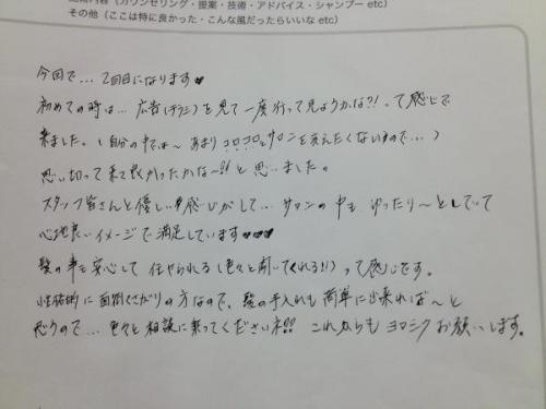 スゴくお店の雰囲気がよく、照明や壁がかわいくてステキでした!担当してくれた方もいい方で、私が優柔不断で髪型にあまりこだわりがないので色々アドバイスを頂けて助かりましたし、スタイリングの方法やコツなども教えてくださって、朝時間がないのでとても役に立ちました!