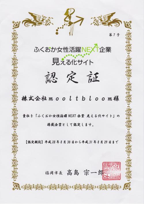 福岡市で2016年8月30日に創設された、企業での女性活躍の推進や働き方の改革を応援するために、企業の取り組みが一目でわかる「ふくおか女性活躍NEXT企業 見える化サイト」に、株式会社mooltbloomが認定されました!